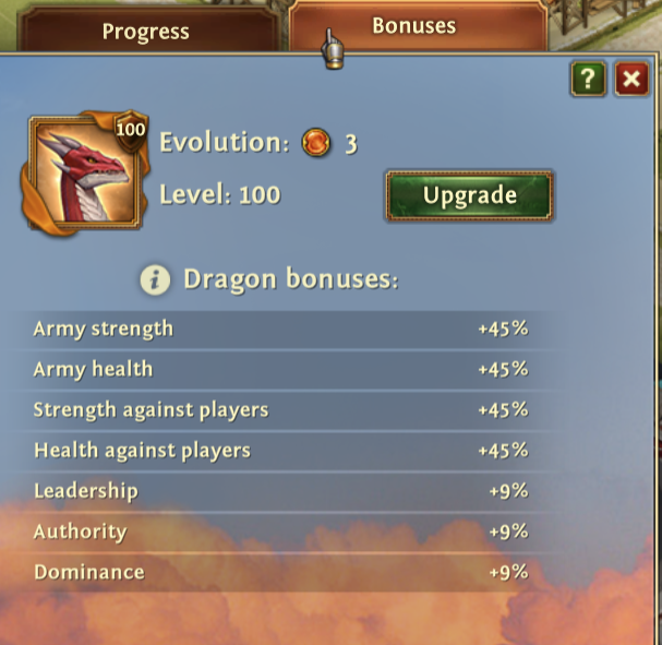 The bonuses that you can see in the Progress tab show the new bonuses and the percentage increase that you will acquire when your Dragon reaches the next evolution level.