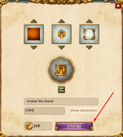 - Enter a new name and/or select a new crest for your Clan, then click Change in order to confirm your selection. Doing so will cost you 50K Gold.