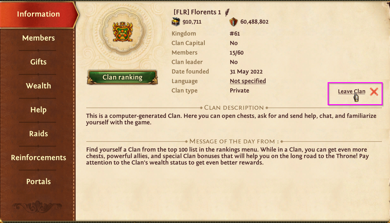 At the beginning of the game, you will be invited to join a computer-generated clan. These Clans don't have a leader or a capital. They are designed to familiarize you with the basic mechanics of Clans and are very limited in terms of the range of benefits they offer, compared to player-created Clans.