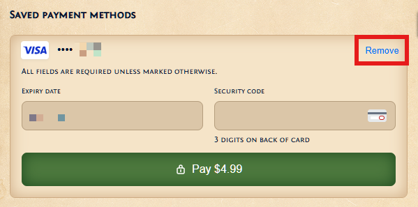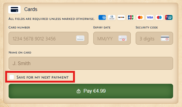If you wish to save a payment method on the game website or desktop client, you can select any offer and click Buy, then fill in the payment details and press "Save for my next payment."