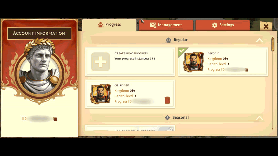 In the Progress tab, you'll see a list of your game progress instances, with your current progress indicated by a green checkmark.