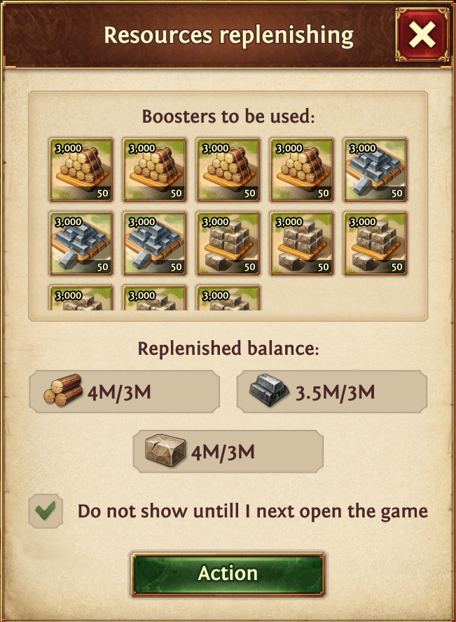 - Ability to replenish resources by opening all necessary chests simultaneously, similar to the window with speedup selection (see screenshot)