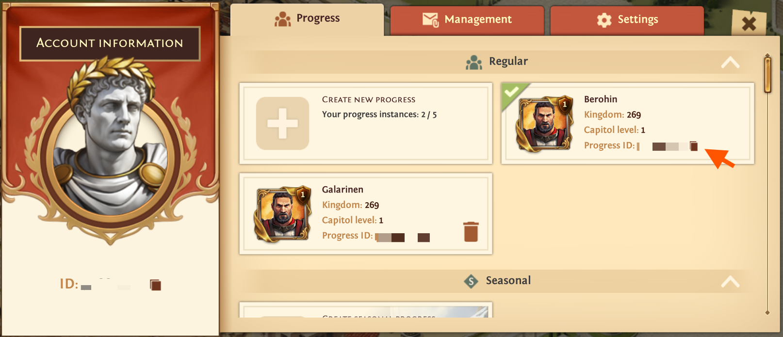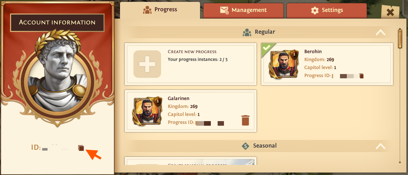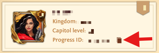 If you are looking for a progress ID, you can find it next to your player icon, below your Capitol level in the Progress tab. It may start with "tb:" or other letters.