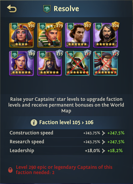 Here we can see that in order to level up the Resolve faction to level 106, we need to get two epic OR legendary Captains to level 290. Please note the highlighted OR. You will meet the requirement for the upgrade if: